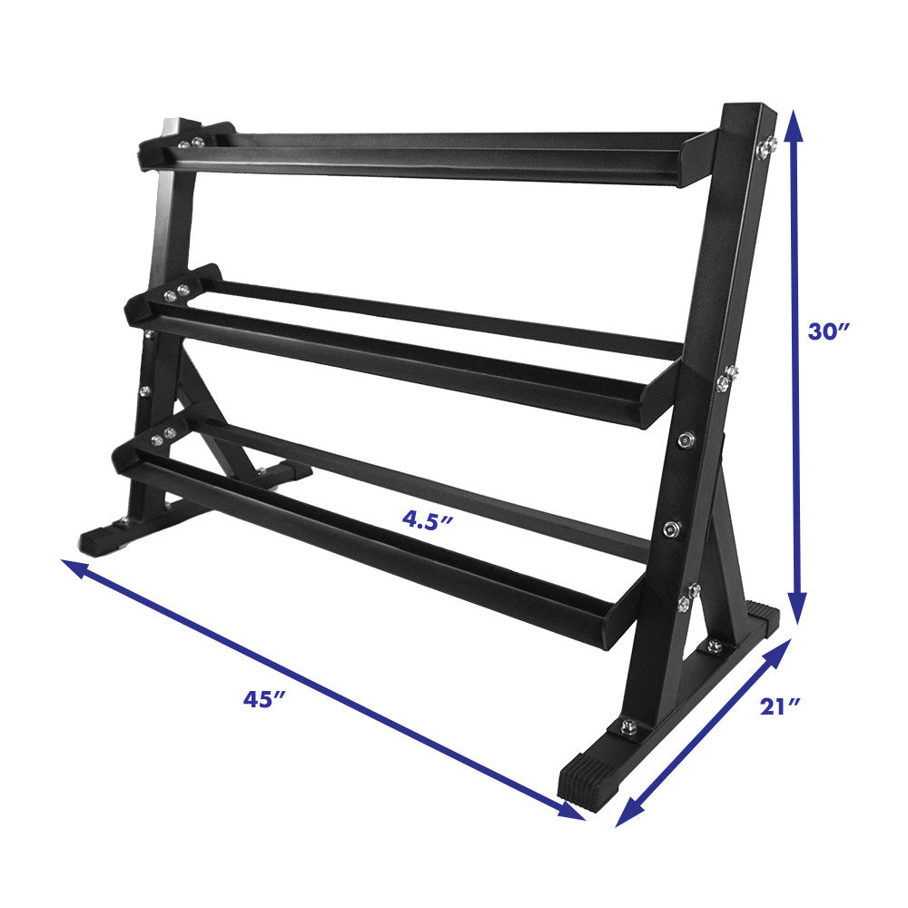 - Sturdy 3-Tier Dumbbell Rack – Steel frame with black powder-coated finish and rubber feet caps for stability and floor protection.