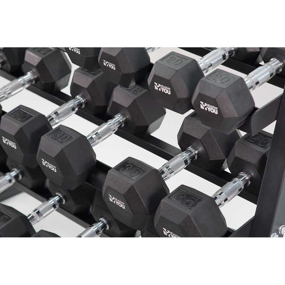The Healthy You Rubber Hex Dumbbell Complete Package Set Includes the rack and 2 each of the following dumbbells: 5,10,15,20,25,30,35,40,45,50 lbs dumbbells