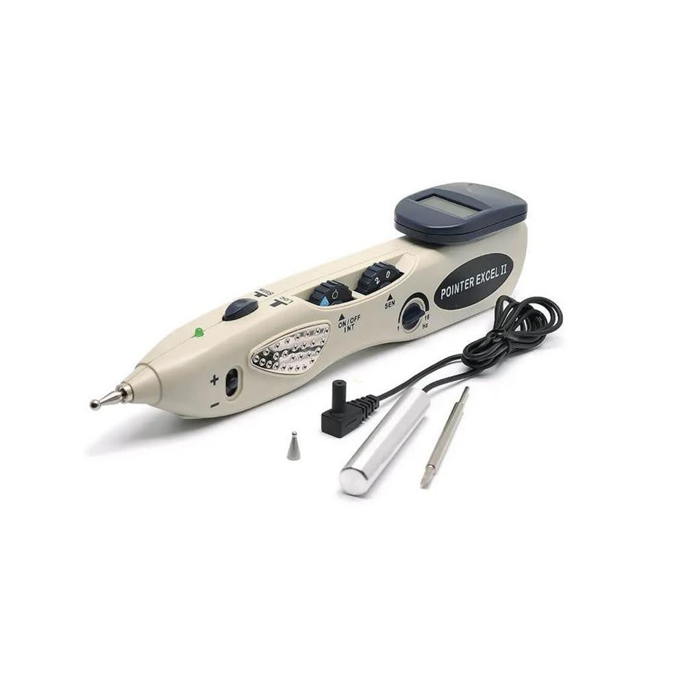 The Pointer Excel II features two grounding plates on the unit(allowing use with either left or right hands) as well as a hand probe with grounding pole and attached wire. Two probe tips are included with unit: ear 2 mm (0.08") and body 4 mm (0.16"). Other standard accessories include carrying case and instructions.