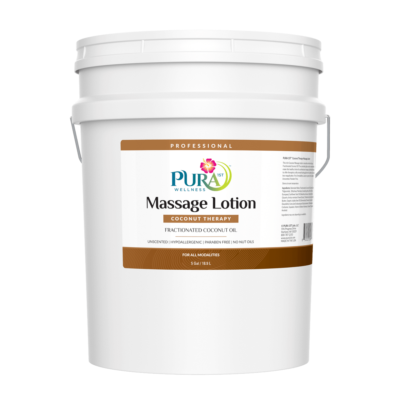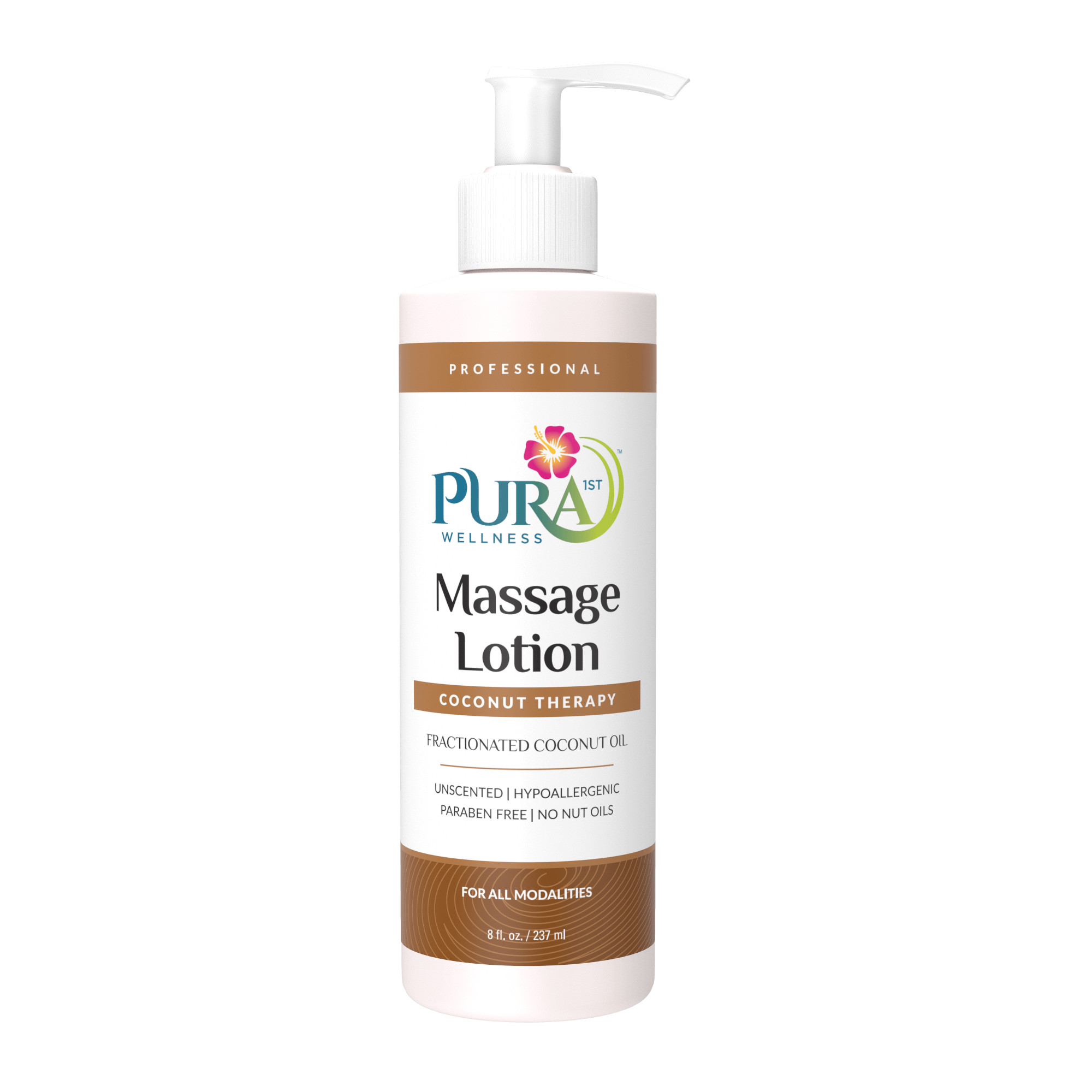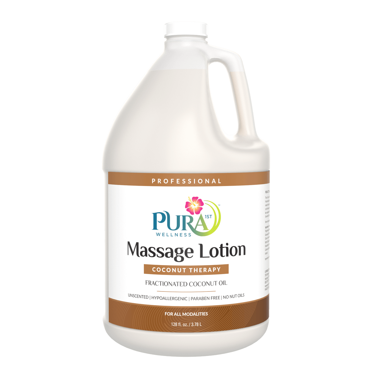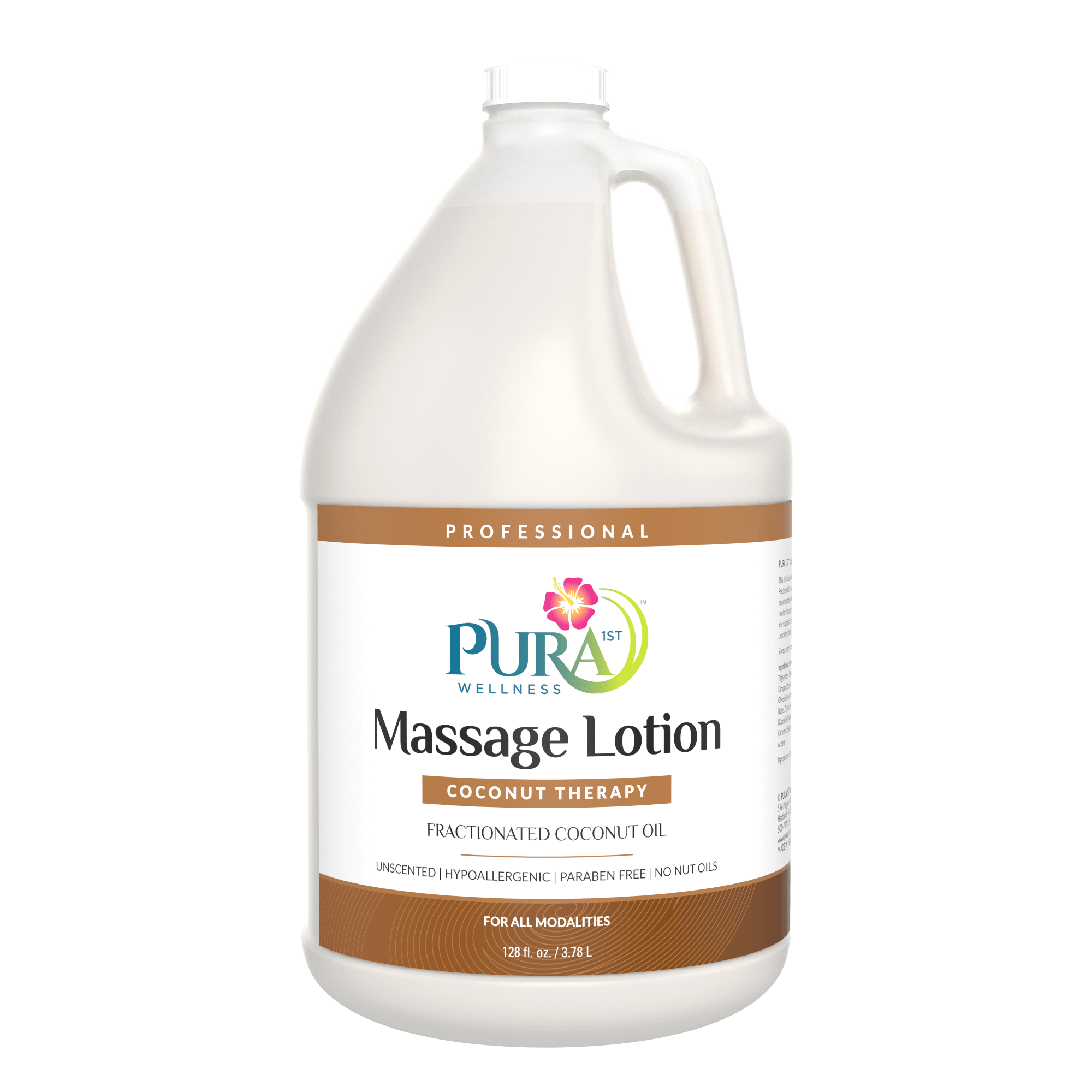 PURA 1ST Wellness Professional Coconut Therapy Massage Lotion – This rich Coconut Massage Lotion is naturally enriched with pure Fractionated Coconut Oil! The controlled glide and skin nutrient benefits make this healthy choice for professional massage. Specifically formulated to offer therapists a silky smooth lasting glide with a lighter touch, requiring less reapplication. For all modalities. Leaves no greasy feel. Completely Unscented. Paraben Free