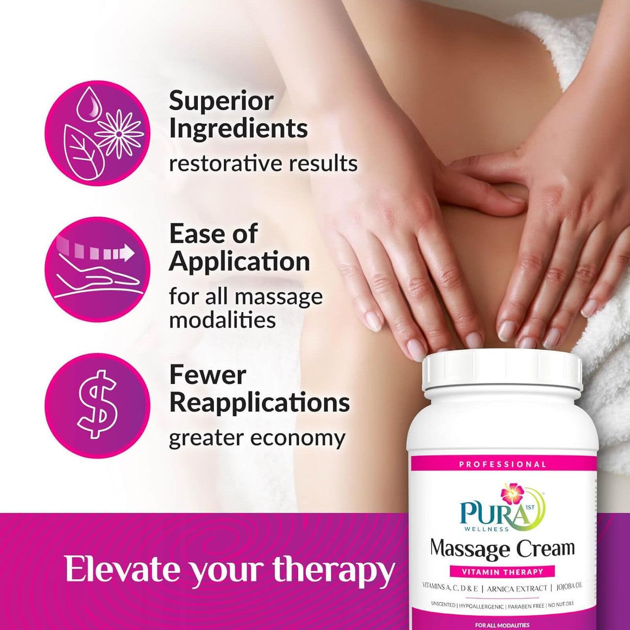 PURA 1ST Wellness Professional Vitamin Therapy Massage Cream – This advanced Vitamin Massage Cream is enriched with Vitamins A, C, D & E, Arnica Extract, and Jojoba Oil known for it’s exceptional quality for the skin – making it the healthy choice for professional massage. Formulated to offer therapists a lasting glide and superb grip; less glide than an oil or gel yet won’t absorb as fast as a lotion. For all modalities..