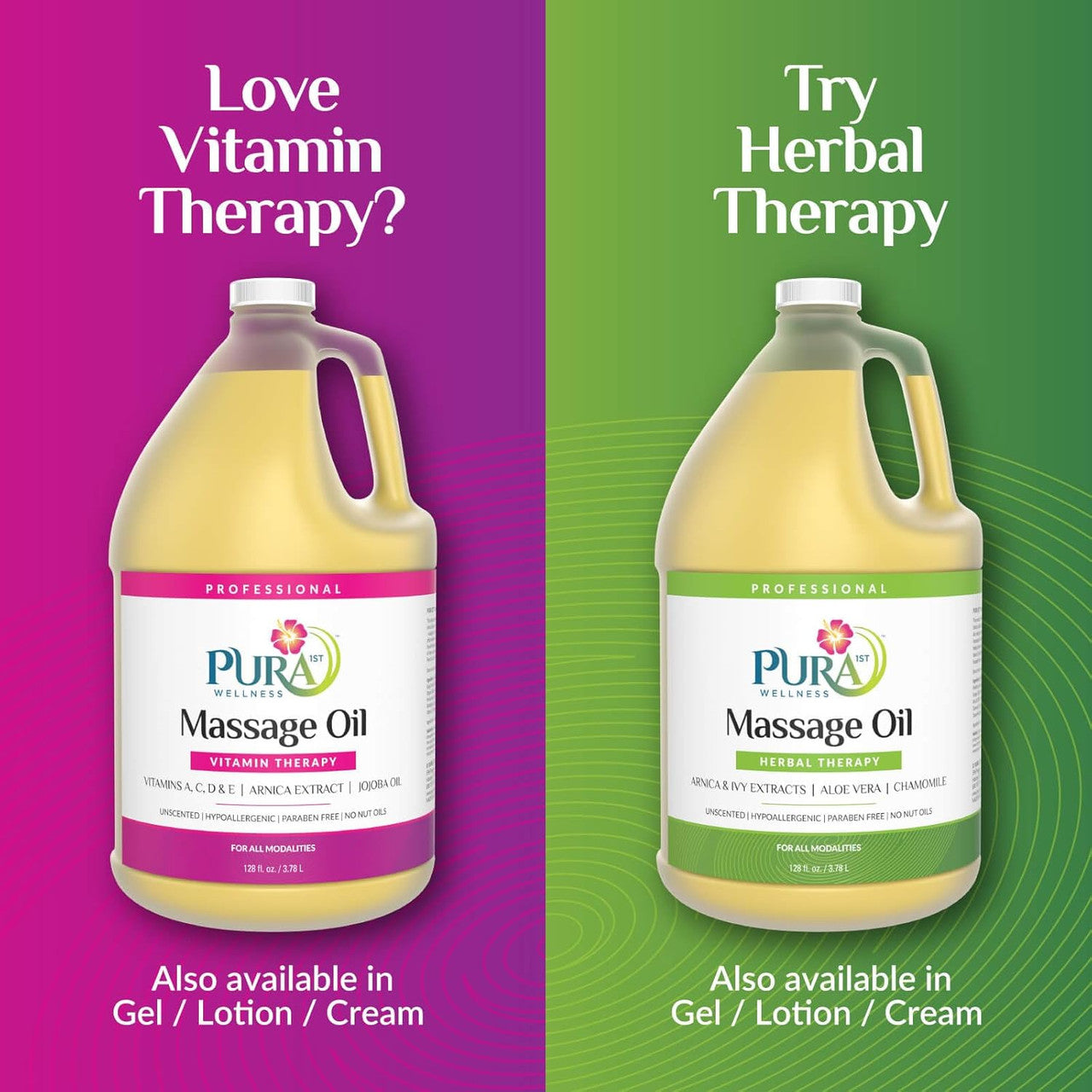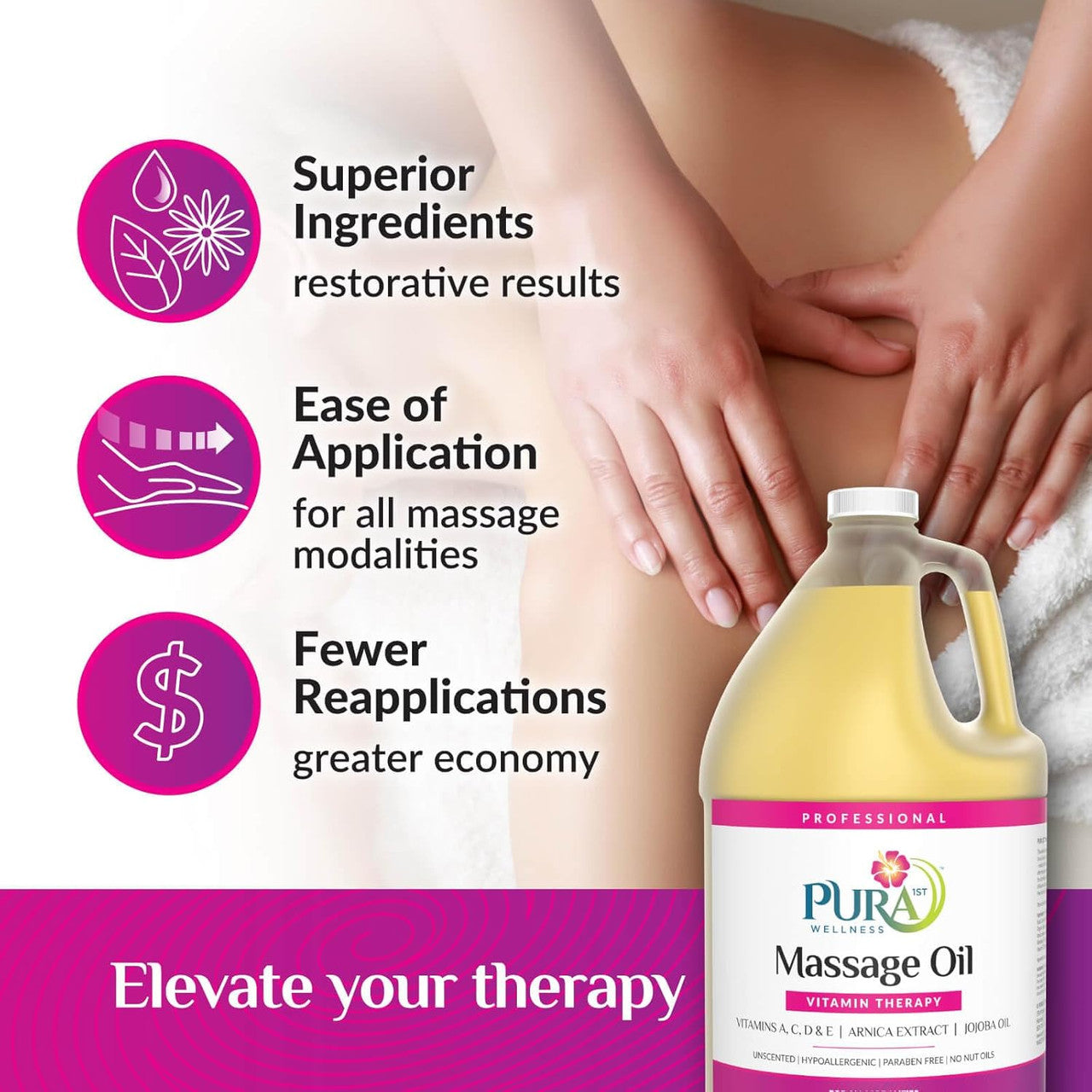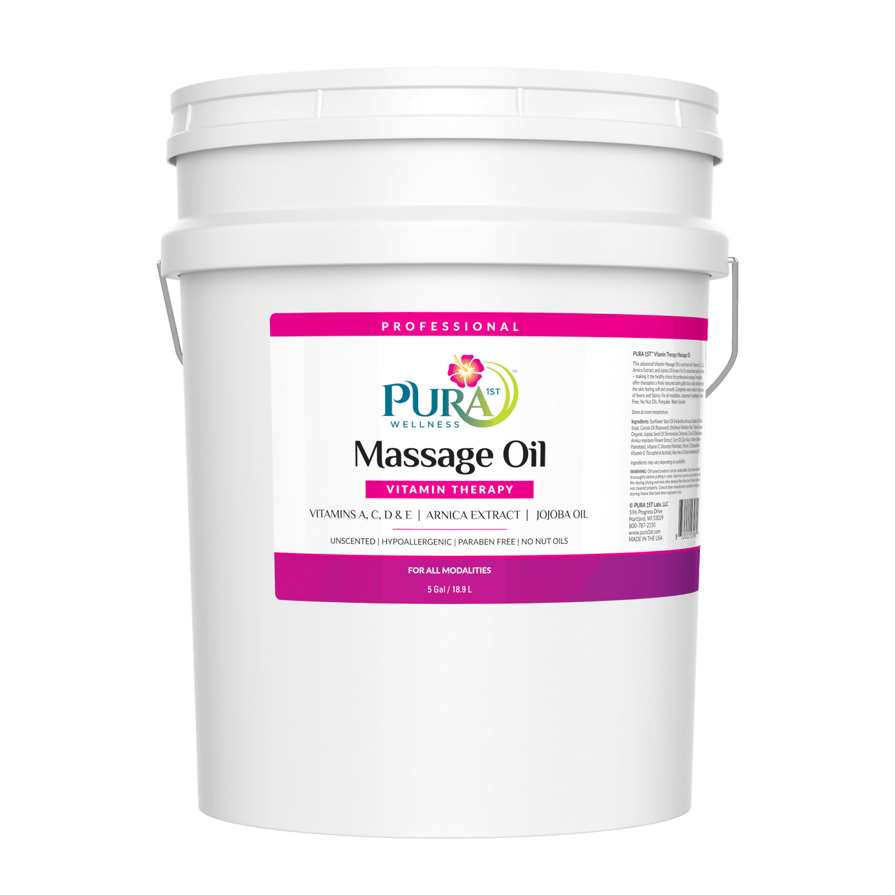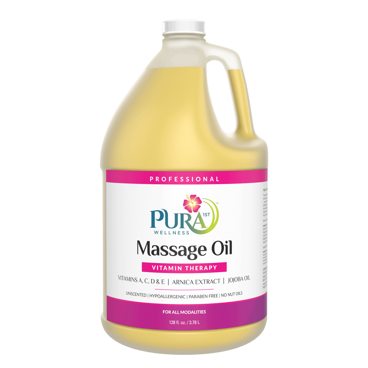 PURA 1ST Wellness Professional Vitamin Therapy Massage Oil – This advanced Vitamin Massage Oil is enriched with Vitamins A, C, D & E, Arnica Extract, and Jojoba Oil known for it’s exceptional quality for the skin – making it the healthy choice for professional massage. Formulated to offer therapists a finely textured satiny glide that is easily absorbed leaving the skin feeling soft and smooth. Completely water dispersible for easy cleanup of linens and fabrics. For all modalities.