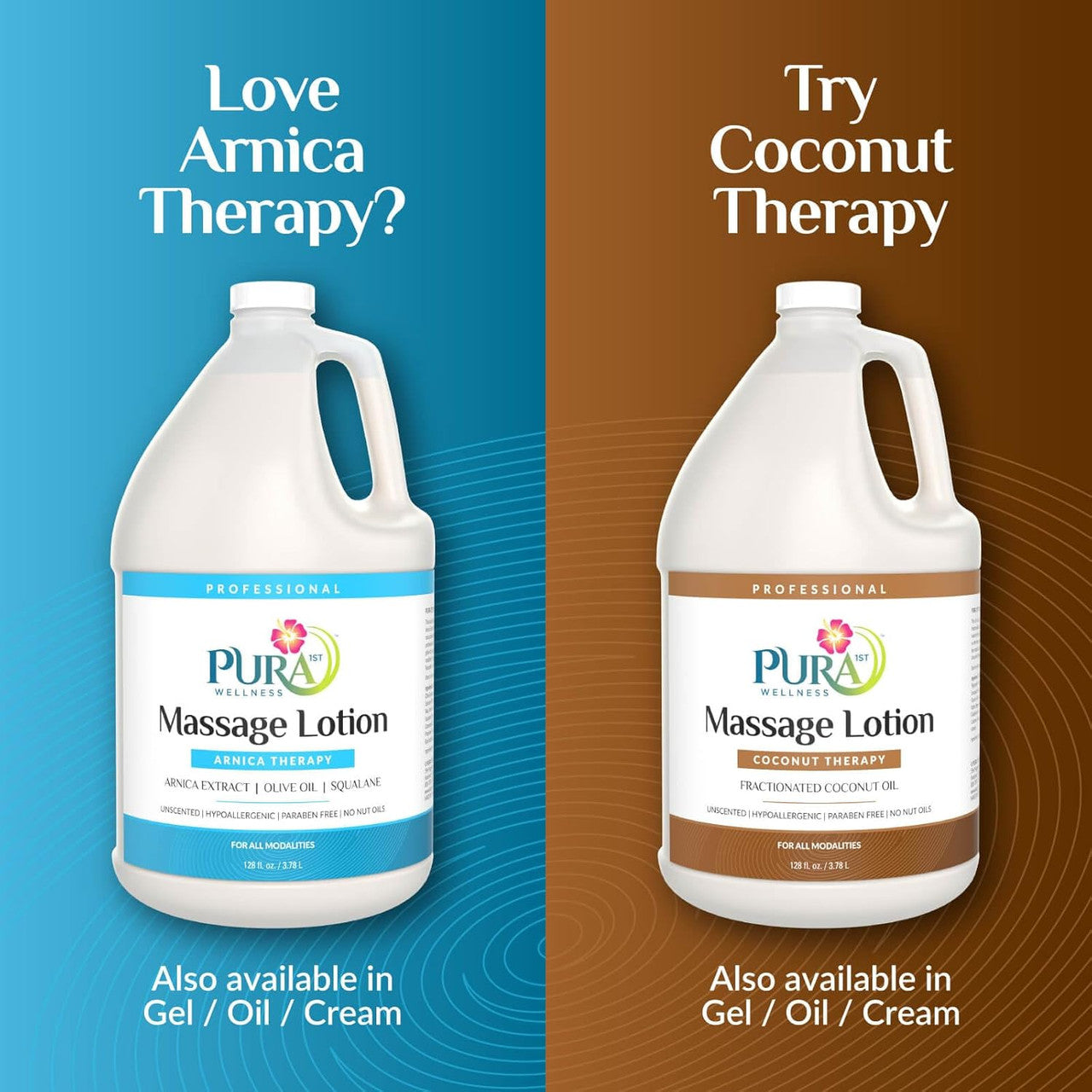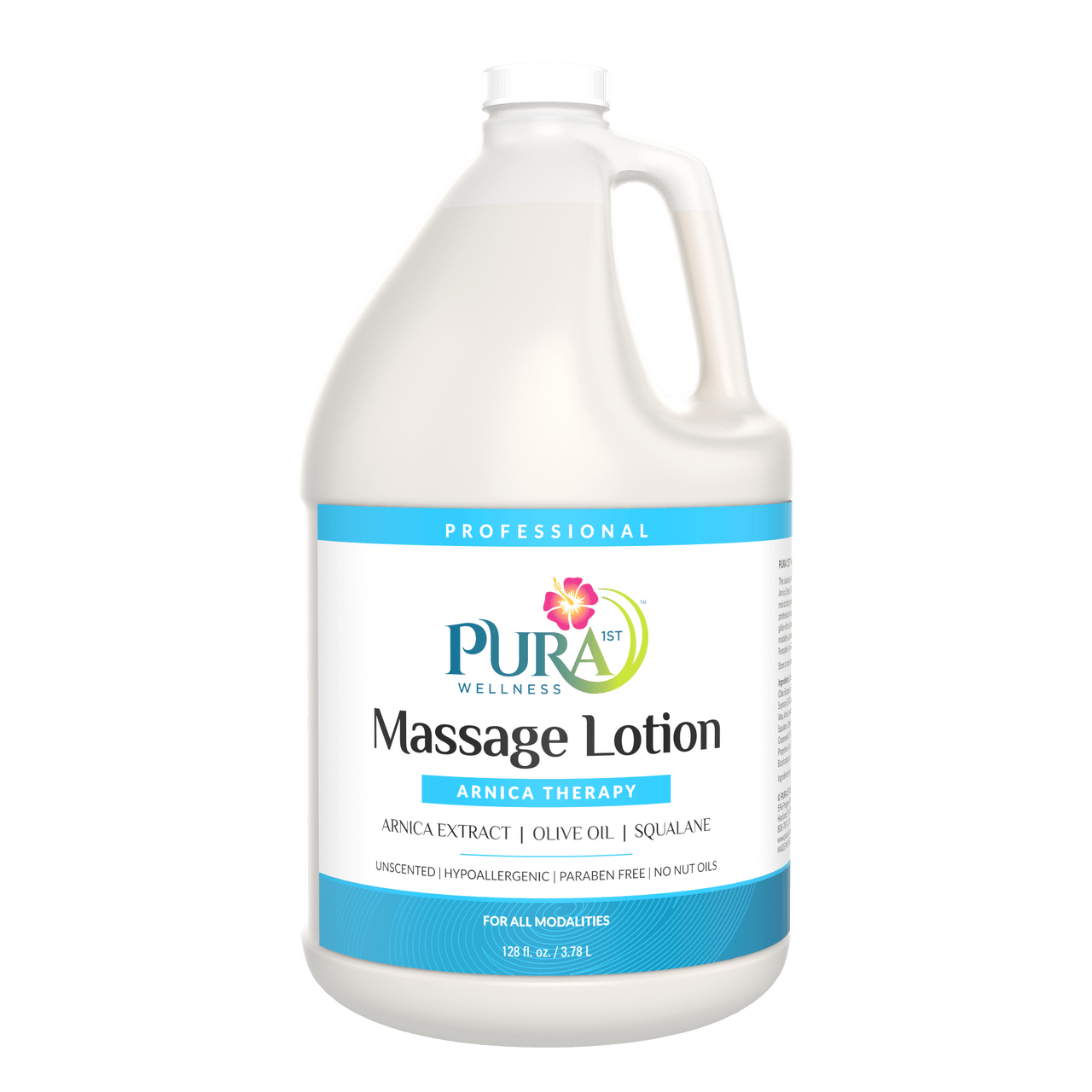PURA 1ST Wellness Professional Arnica Therapy Massage Lotion – This luxurious Arnica Massage Lotion is naturally enriched with Arnica Extract, Olive Oil, and Squalane known for it’s superior skin moisturizing properties – making it the healthy choice for professional massage. Formulated to offer therapists a lasting glide with a lighter touch, requiring less reapplications. For all modalities.