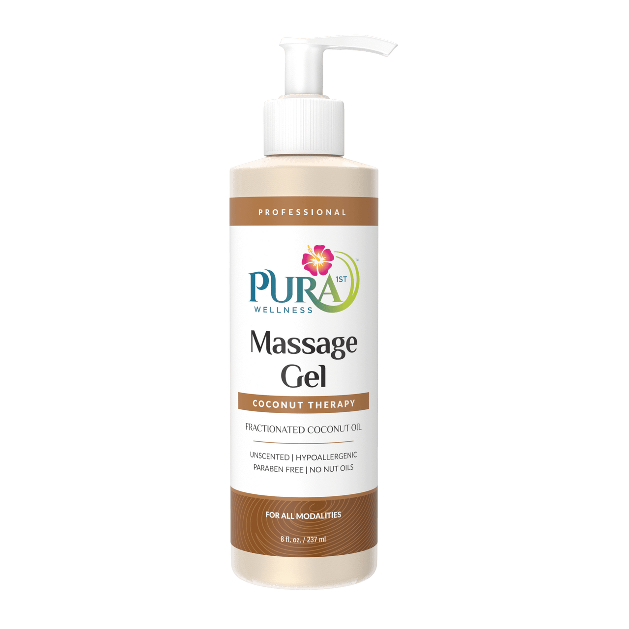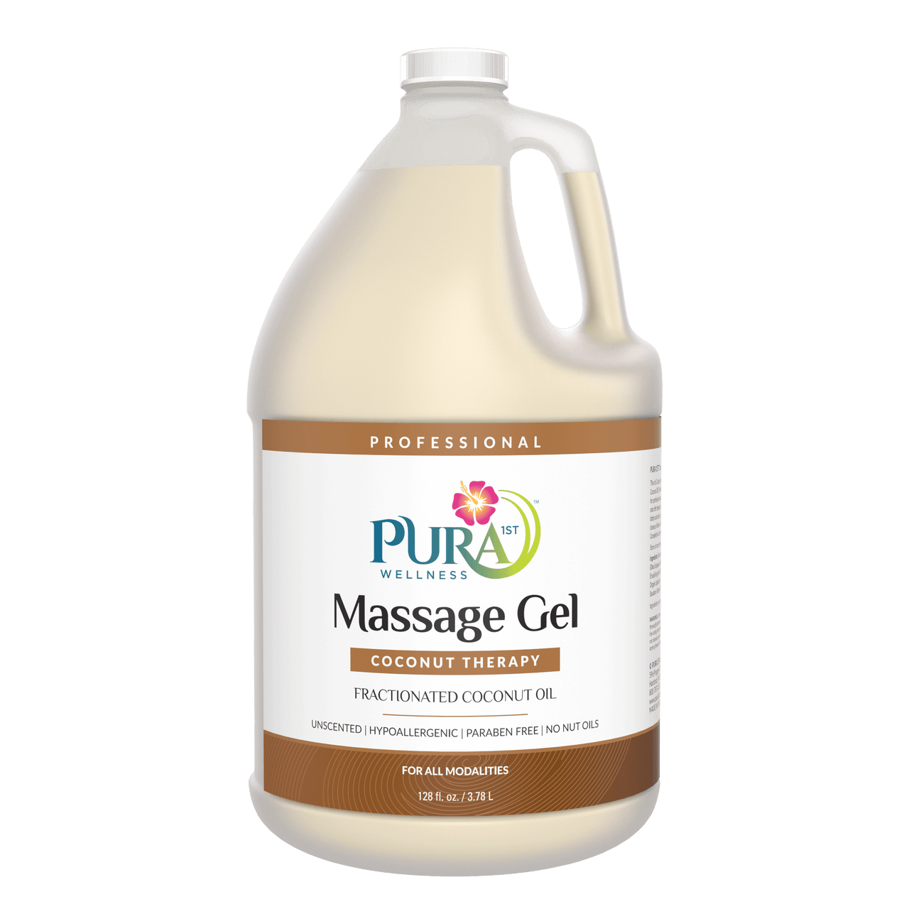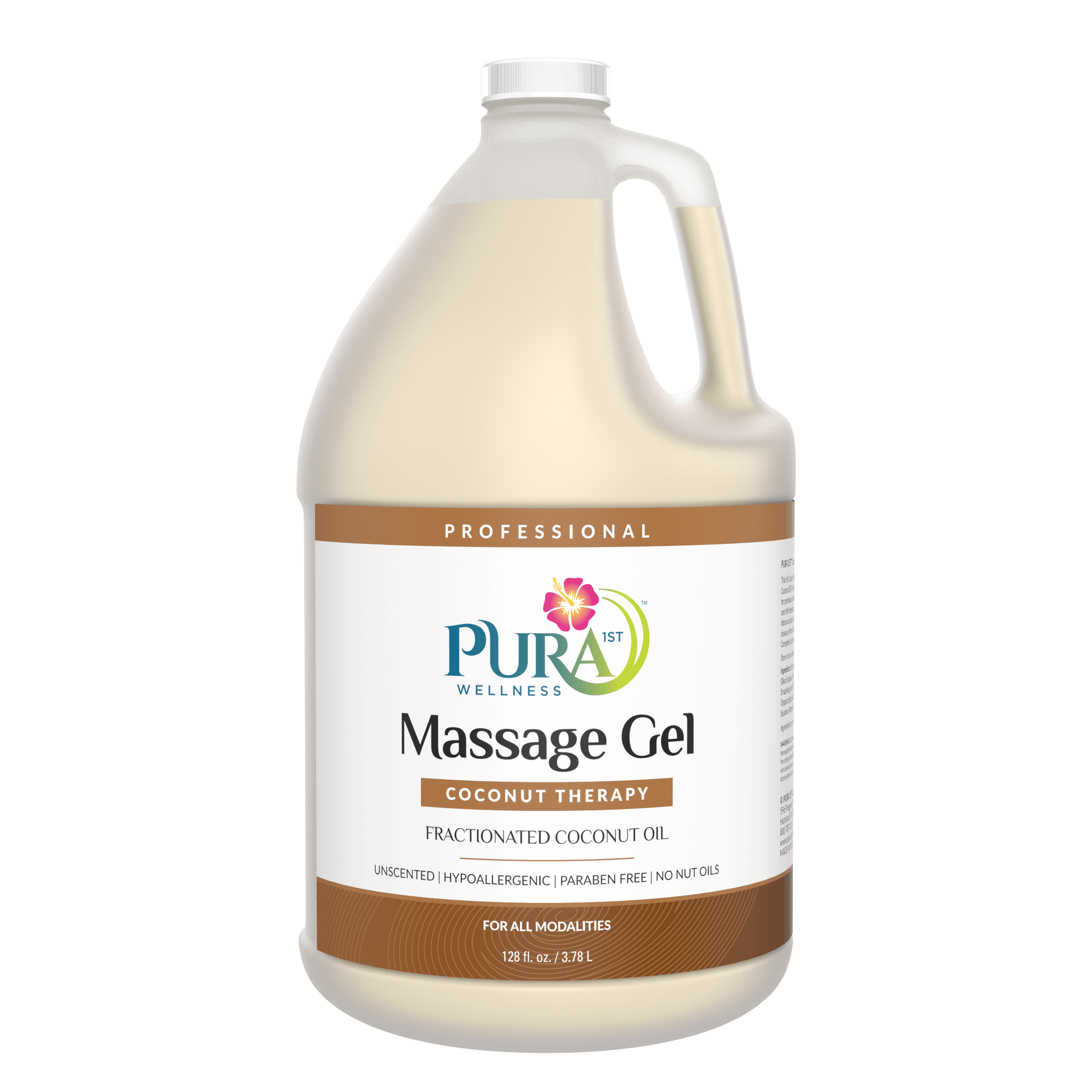 PURA 1ST Wellness Professional Coconut Therapy Massage Gel – This rich Coconut Massage Gel is naturally enriched with pure Fractionated Coconut Oil! The satiny glide and skin nutrient benefits make this healthy choice for professional massage. Specifically formulated to leave the skin silky smooth and offer therapists a light oil texture and lasting glide that outperforms creams, lotions and oils so you will use less per application. Water dispersible for easy cleanup of linens and fabrics. For all modalities. Leaves no greasy feel. Completely Unscented. Paraben Free