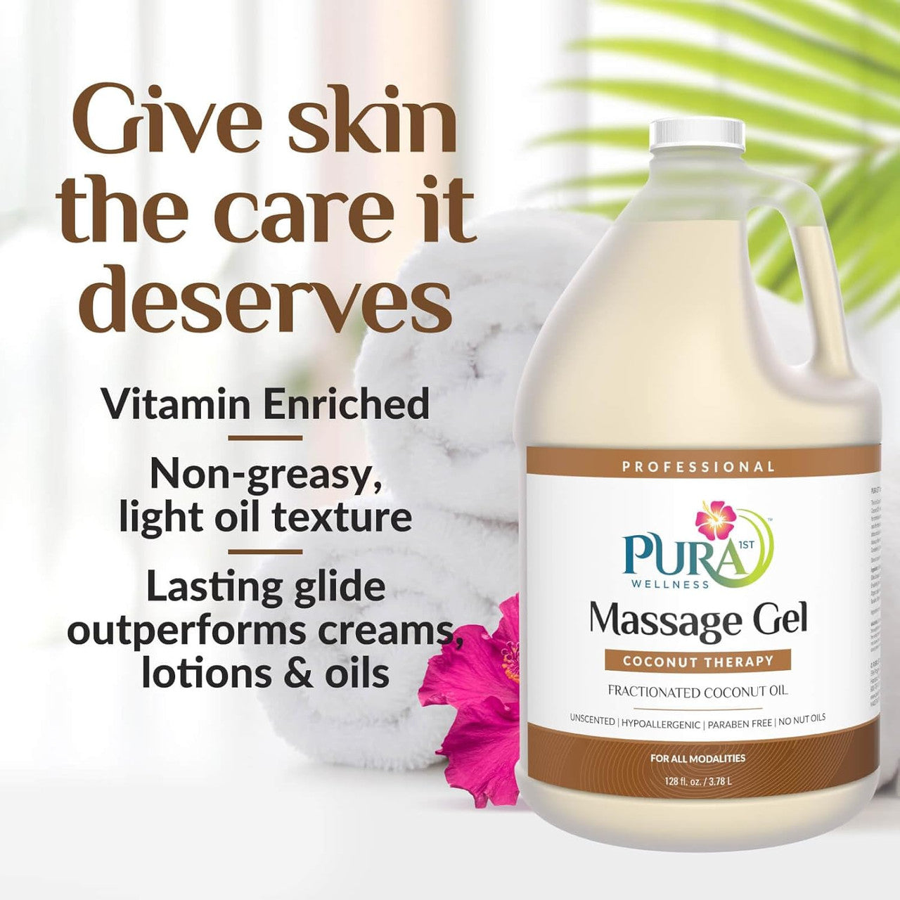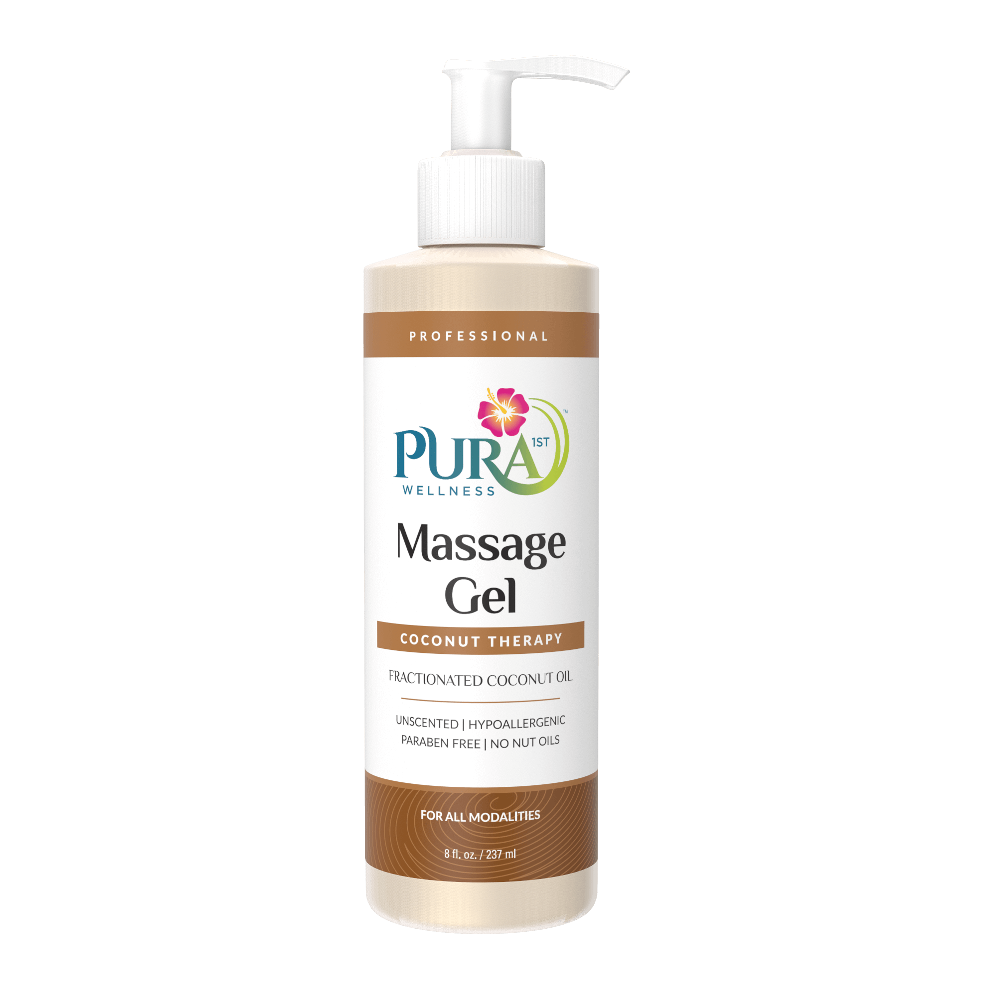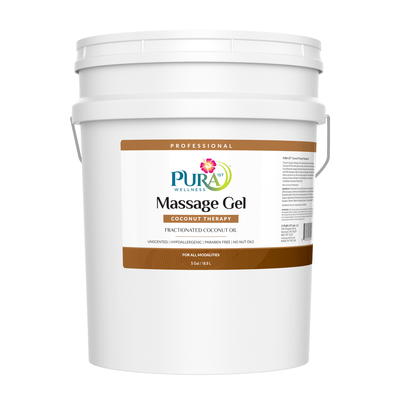 PURA 1ST Wellness Professional Coconut Therapy Massage Gel – This rich Coconut Massage Gel is naturally enriched with pure Fractionated Coconut Oil! The satiny glide and skin nutrient benefits make this healthy choice for professional massage. Specifically formulated to leave the skin silky smooth and offer therapists a light oil texture and lasting glide that outperforms creams, lotions and oils so you will use less per application. Water dispersible for easy cleanup of linens and fabrics. For all modalities. Leaves no greasy feel. Completely Unscented. Paraben Free