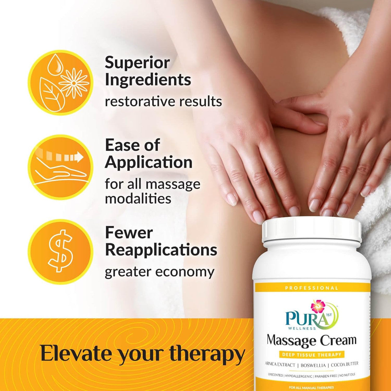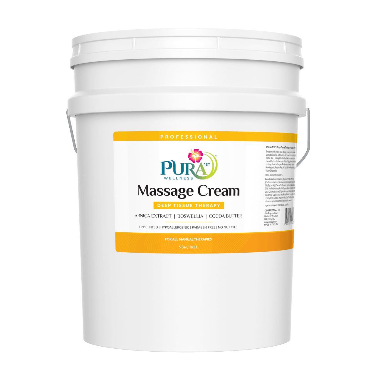 PURA 1ST Wellness Professional Deep Tissue Therapy Massage Cream – This extra rich Deep Tissue Massage Cream is enriched with Arnica Extract, Boswellia, and Cocoa Butter known for it’s exceptional quality for the skin – making it the healthy choice for professional massage. Formulated to offer therapists a lasting high glide and superb grip; ideal for deep tissue techniques. For all manual therapies.