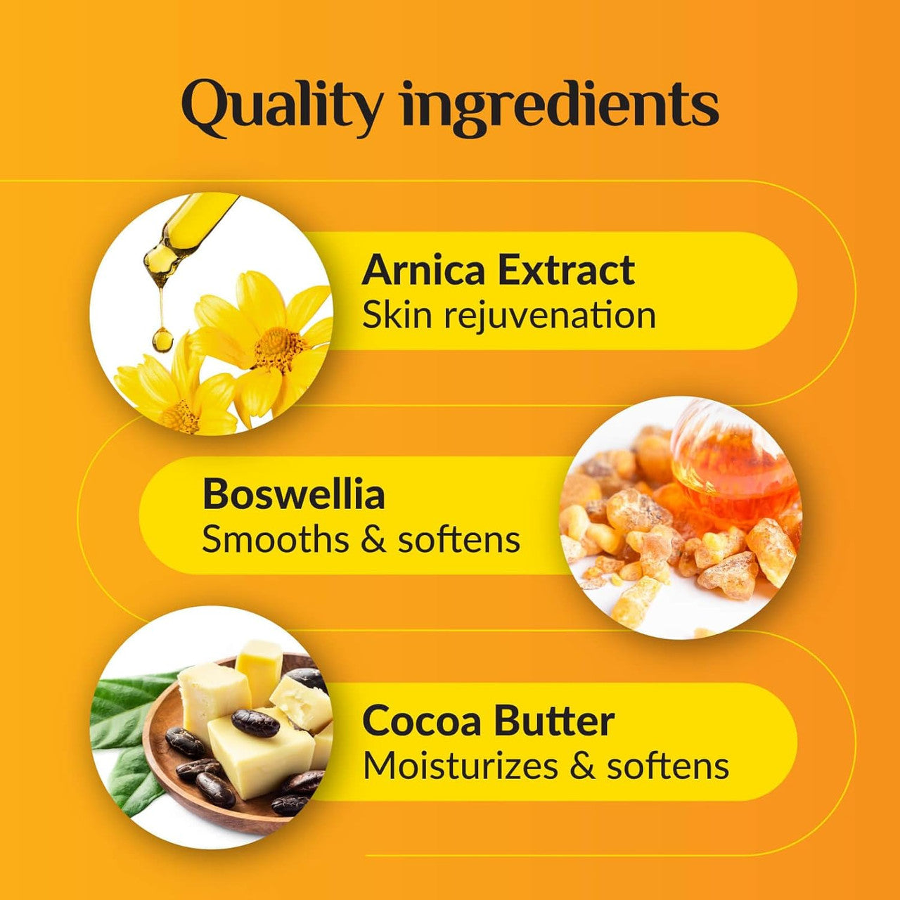 Key Ingredients: Arnica Extract, Boswellia, Cocoa Butter, Organic Jojoba Oil, Safflower Oil, Sunflower Oil, Grapeseed Oil, Olive Oil, Vegetable Glycerin, Vitamin E