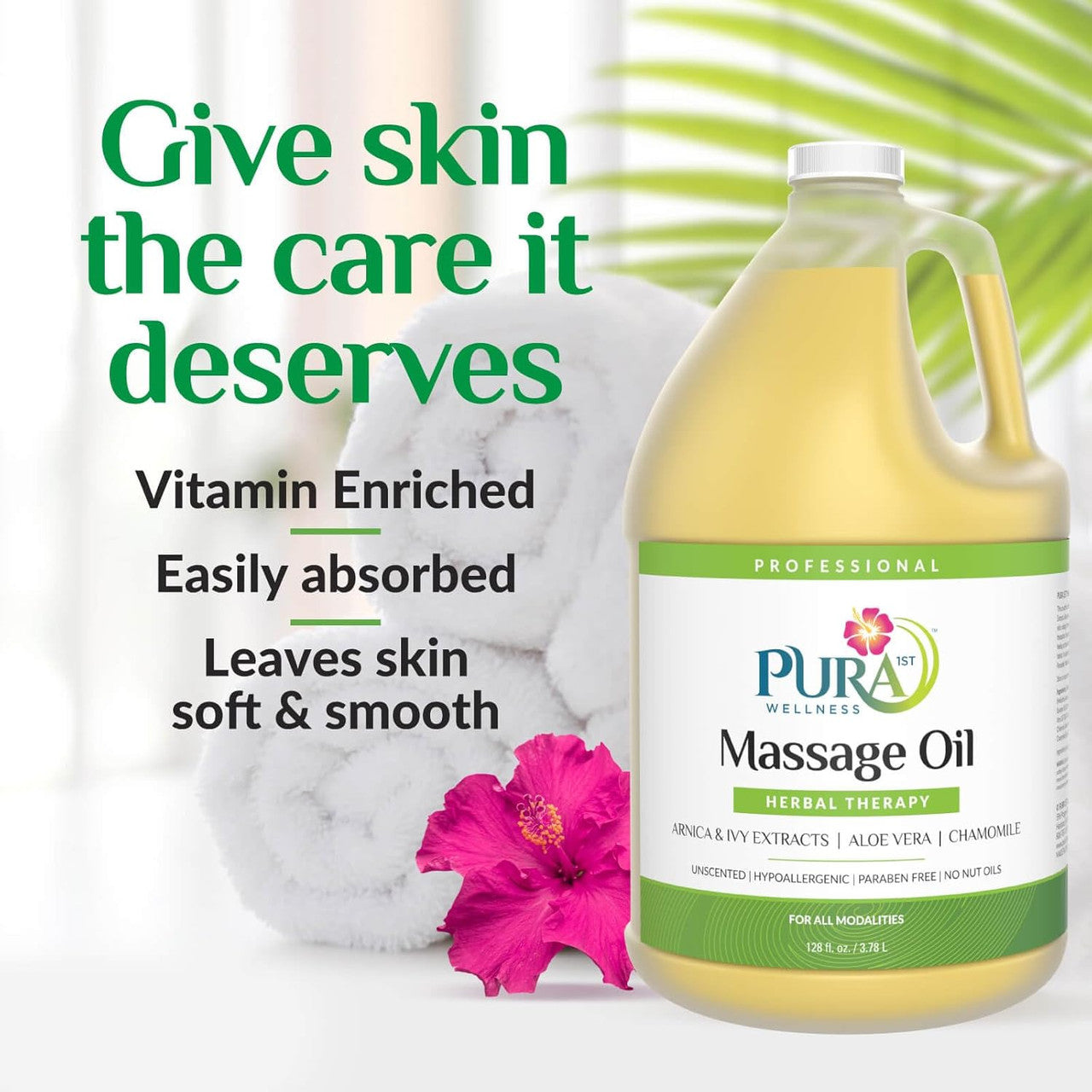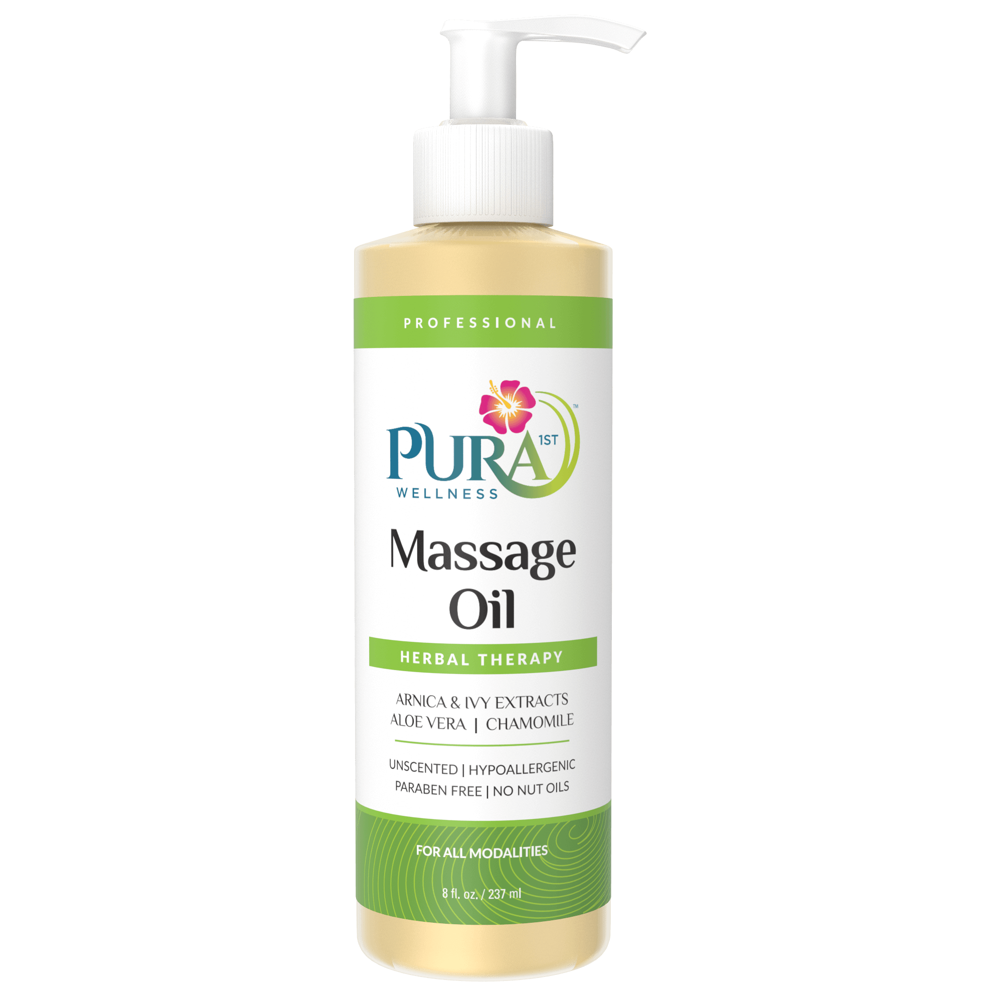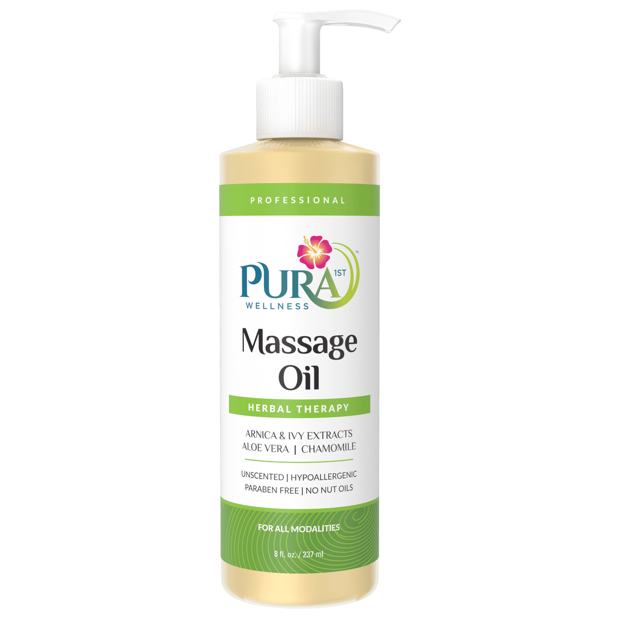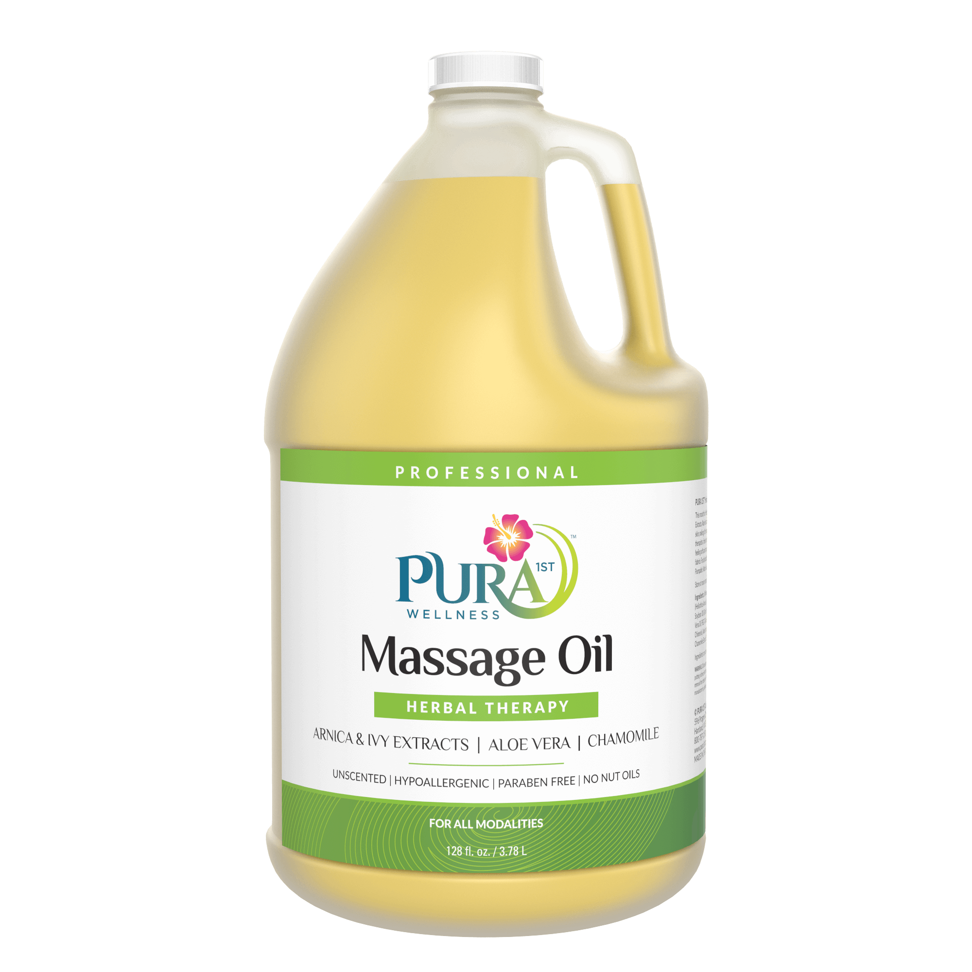 PURA 1ST Wellness Professional Herbal Therapy Massage Oil – This smooth rich Herbal Massage Oil is naturally infused with Arnica & Ivy Extracts, Aloe Vera, and Chamomile known for it’s exceptional quality for the skin, making it the healthy choice for professional massage. Formulated to offer therapists a finely textured satiny glide that is easily absorbed leaving the skin feeling soft and smooth. Completely water dispersible for easy cleanup of linens and fabrics. For all modalities.