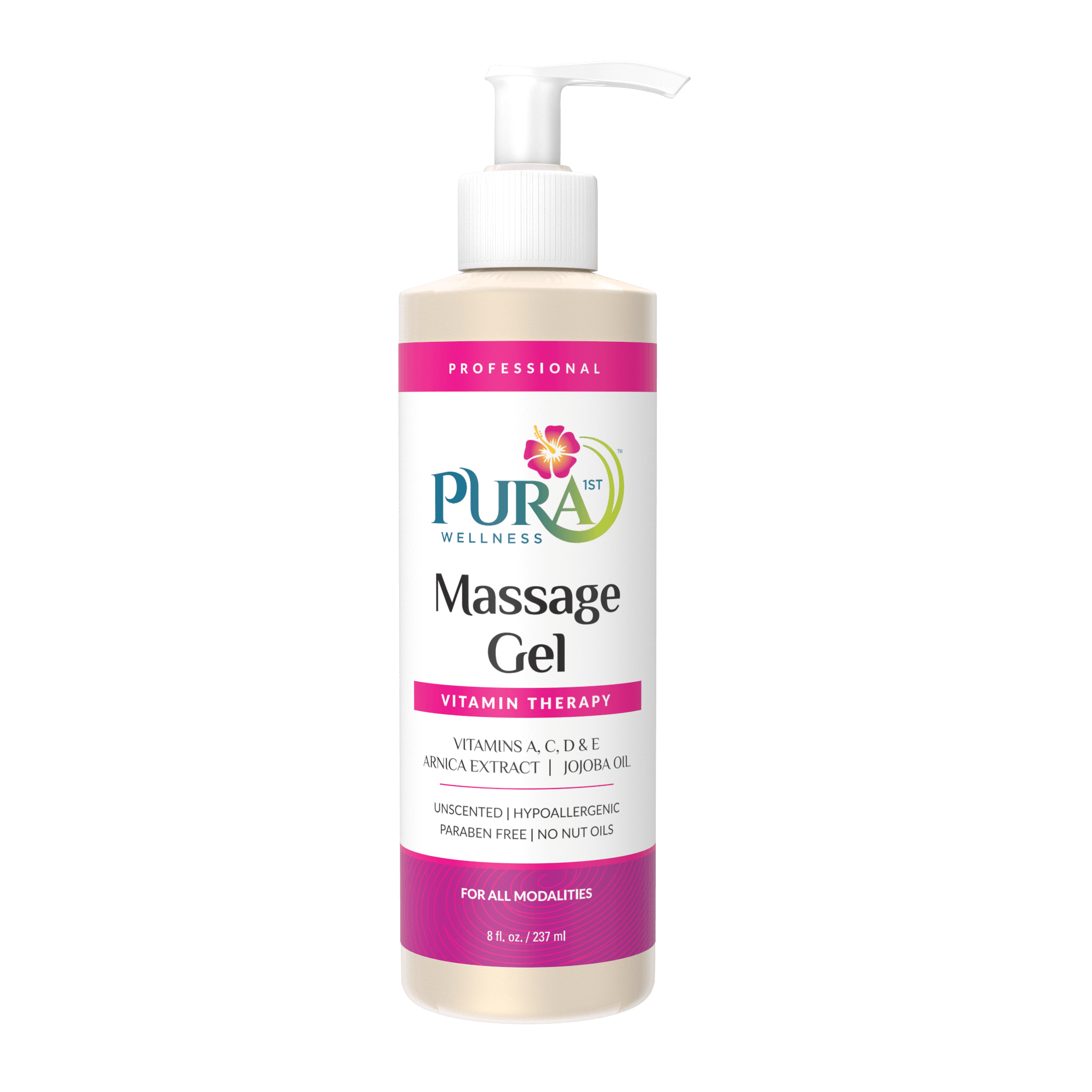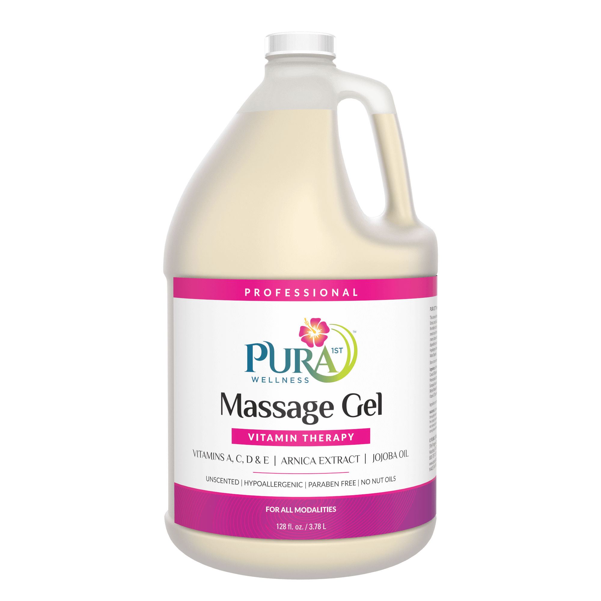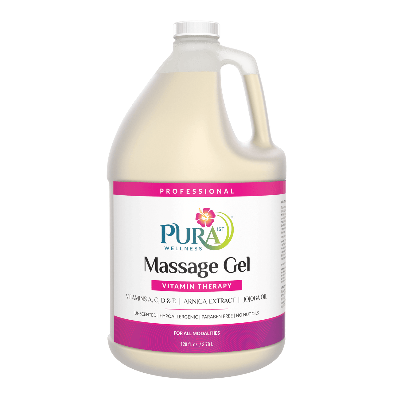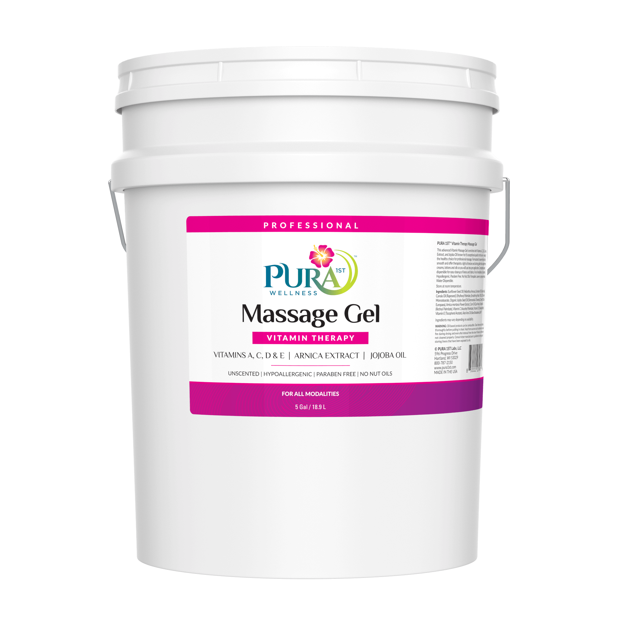PURA 1ST Wellness Professional Vitamin Therapy Massage Gel – This advanced Vitamin Massage Gel is enriched with Vitamins A, C, D & E, Arnica Extract, and Jojoba Oil known for it’s exceptional quality for the skin – making it the healthy choice for professional massage. Formulated to leave the skin silky smooth and offer therapists a light oil texture and lasting glide that outperforms creams, lotions and oils so you will use less per application. Completely water dispersible for easy cleanup of linens and fabrics. For all modalities.